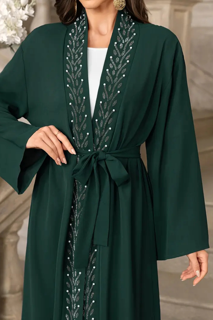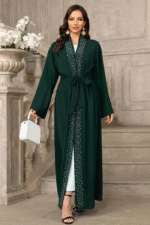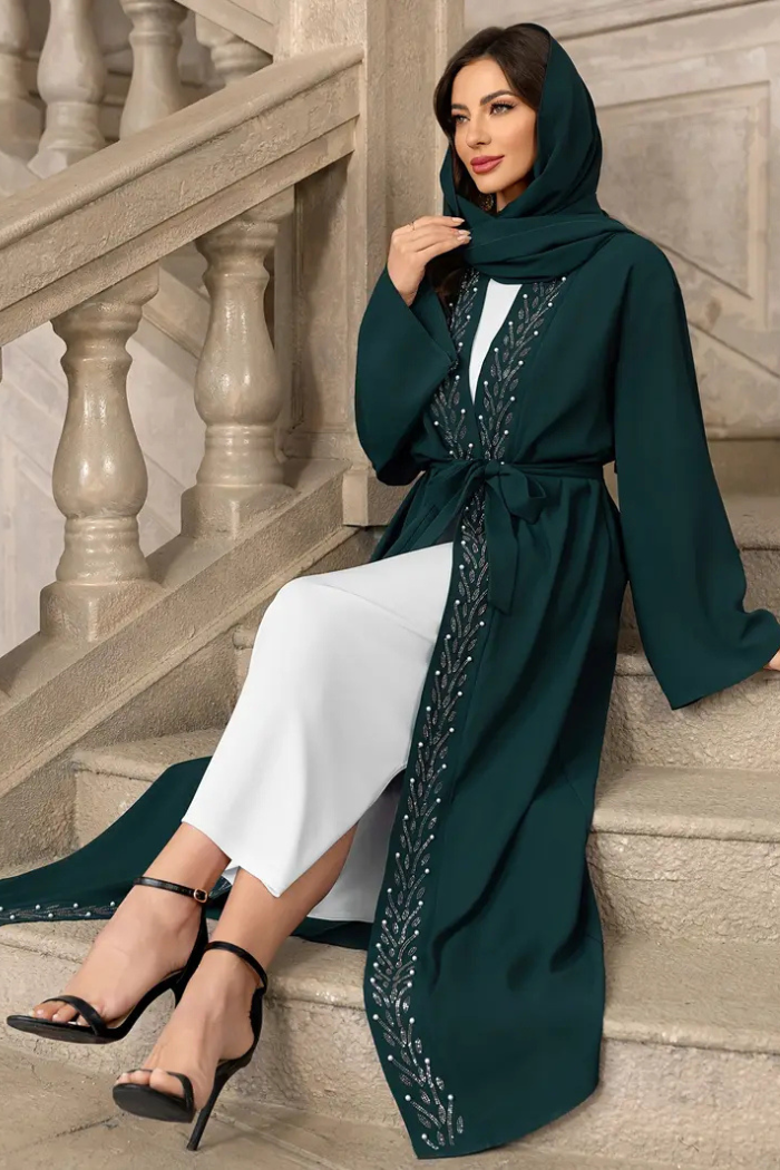 Experience complete elegance with the Veloura Dubai Luxe 4-Piece Set. This stylish ensemble includes a long-sleeve outer dress, a sleeveless inner layer, a matching headscarf, and a coordinating belt for a polished look. Designed with Dubai-inspired sophistication, it blends modesty and modern fashion effortlessly. Perfect for formal occasions, cultural events, or everyday grace.