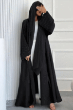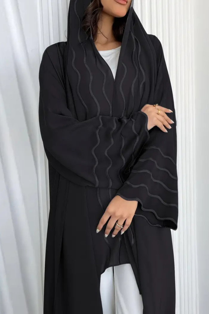 Elevate your look with the Veloura Striped Grace Two-Piece Abaya Set, designed for elegance and ease. This set features a flowing open abaya with soft ruffle sleeves, paired with a stylish striped headscarf and matching cuff details — no embroidery, just pure refined simplicity. Perfect for outings, gatherings, and special occasions, this lightweight ensemble brings modern modesty to life with graceful movement and effortless charm.